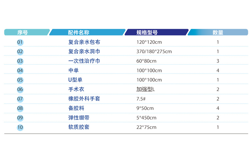 適用于胸腹外科手術(shù),產(chǎn)品主要由高性能無(wú)紡布制成的包布、洞巾、一次性治療巾、中單、手術(shù)衣和外科手套等配件組合而成。洞巾由復(fù)合親水無(wú)紡布制成,手術(shù)關(guān)鍵部位配備有吸液層和集液袋,可根據(jù)臨床需要更改手術(shù)包內(nèi)配件數(shù)量。