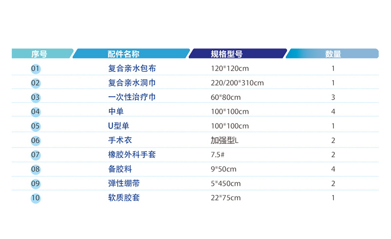 適用于髓關(guān)節(jié)部位手術(shù),產(chǎn)品主要由高性能無紡布制成的包布、洞巾、中單、U型單、手術(shù)衣和彈性繃帶、軟質(zhì)膠套等配件組合而成。洞巾手術(shù)關(guān)鍵部位配備有吸液層、彈性膜和集液袋,可根據(jù)臨床需要更改手術(shù)包內(nèi)配件數(shù)量